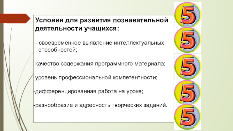 Слайд 15Условия для развития познавательной деятельности учащихся: