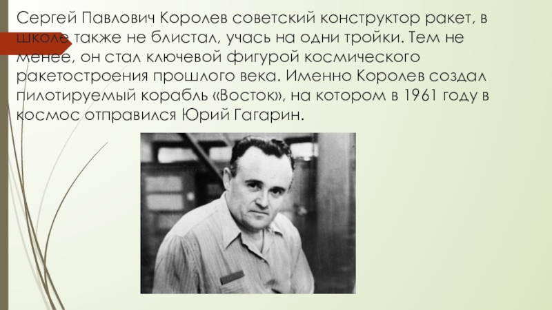 Слайд 36Сергей Павлович Королев советский конструктор ракет, в школе также не блистал,