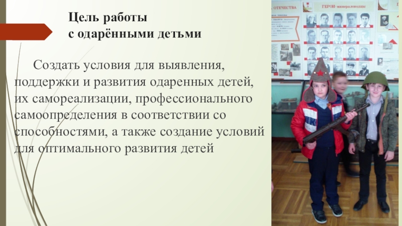 одаренных детей, их самореализации, профессионального самоопределения в соответствии со способностями, а также создание условий для оптимального развития детей