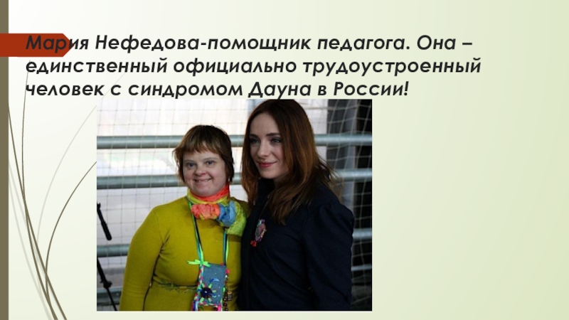 Слайд 8Мария Нефедова-помощник педагога. Она – единственный официально трудоустроенный человек с синдромом
