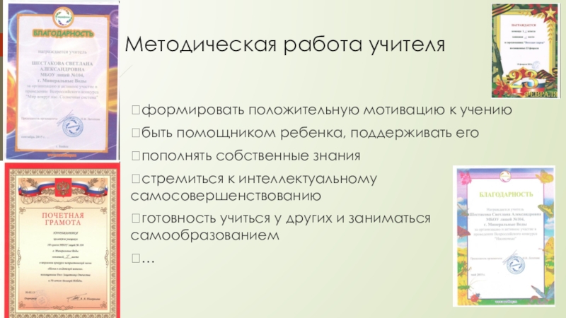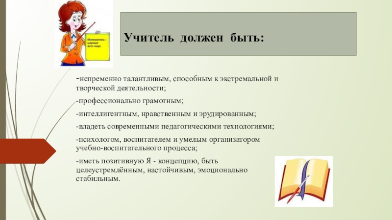 -иметь позитивную Я - концепцию, быть целеустремлённым, настойчивым, эмоционально стабильным.