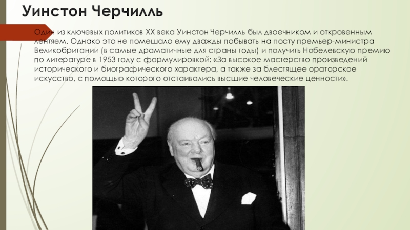 и откровенным лентяем. Однако это не помешало ему дважды побывать на посту премьер-министра Великобритании (в самые драматичные для страны годы) и получить Нобелевскую премию по литературе в 1953 году с формулировкой: «За высокое мастерство произведений исторического и биографического характера, а также за блестящее ораторское искусство, с помощью которого отстаивались высшие человеческие ценности».