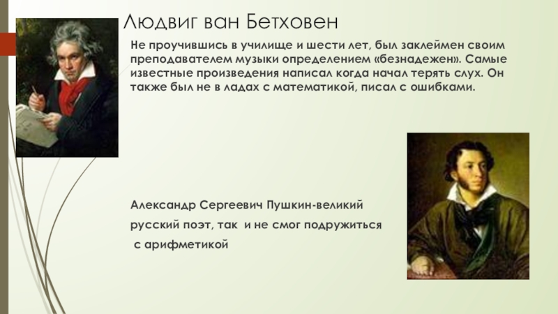 своим преподавателем музыки определением «безнадежен». Самые известные произведения написал когда начал терять слух. Он также был не в ладах с математикой, писал с ошибками.