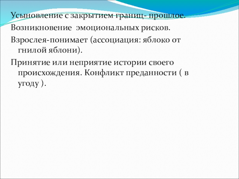 Усыновление с закрытием границ- прошлое.Возникновение эмоциональных рисков.Взрослея-понимает (ассоциация: яблоко от гнилой яблони). Принятие или неприятие истории своего