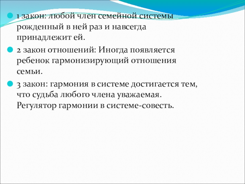 1 закон: любой член семейной системы рожденный в ней раз и навсегда принадлежит ей.2 закон отношений: Иногда