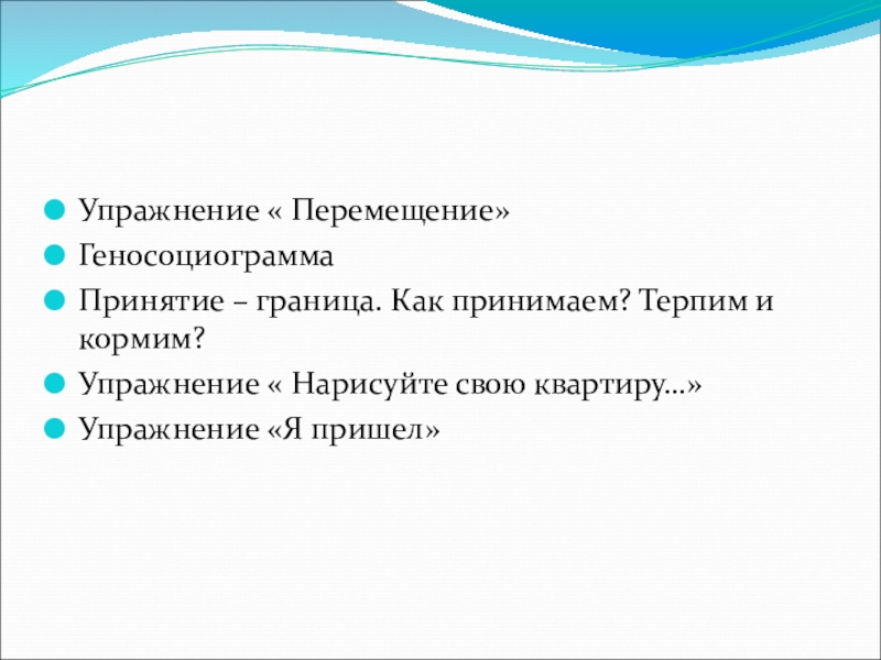 Упражнение « Перемещение»ГеносоциограммаПринятие – граница. Как принимаем? Терпим и кормим?Упражнение « Нарисуйте свою квартиру…»Упражнение «Я пришел»