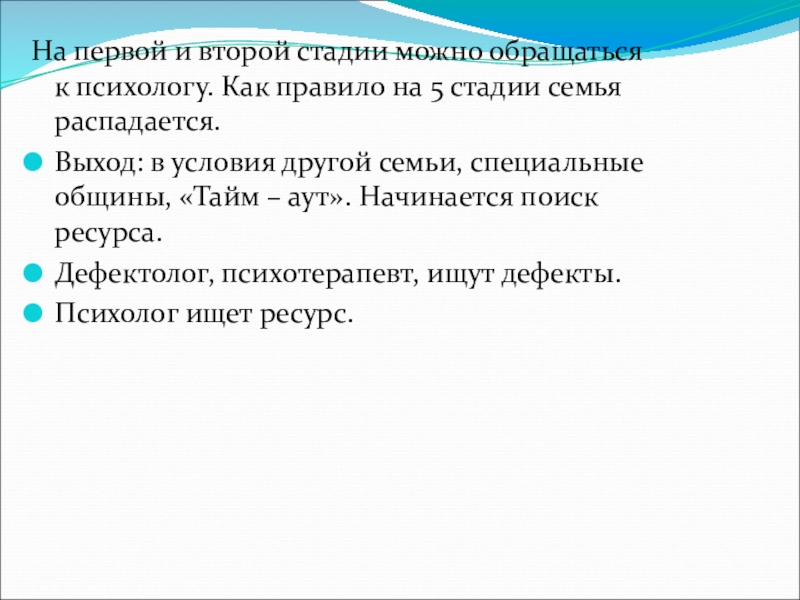 Выход: в условия другой семьи, специальные общины, «Тайм – аут». Начинается поиск ресурса.