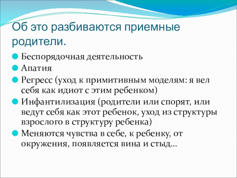 Об это разбиваются приемные родители.Беспорядочная деятельностьАпатияРегресс (уход к примитивным моделям: я вел себя как идиот с этим