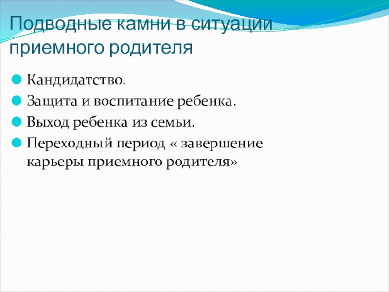 Подводные камни в ситуации приемного родителяКандидатство.Защита и воспитание ребенка.Выход ребенка из семьи.Переходный период « завершение карьеры приемного