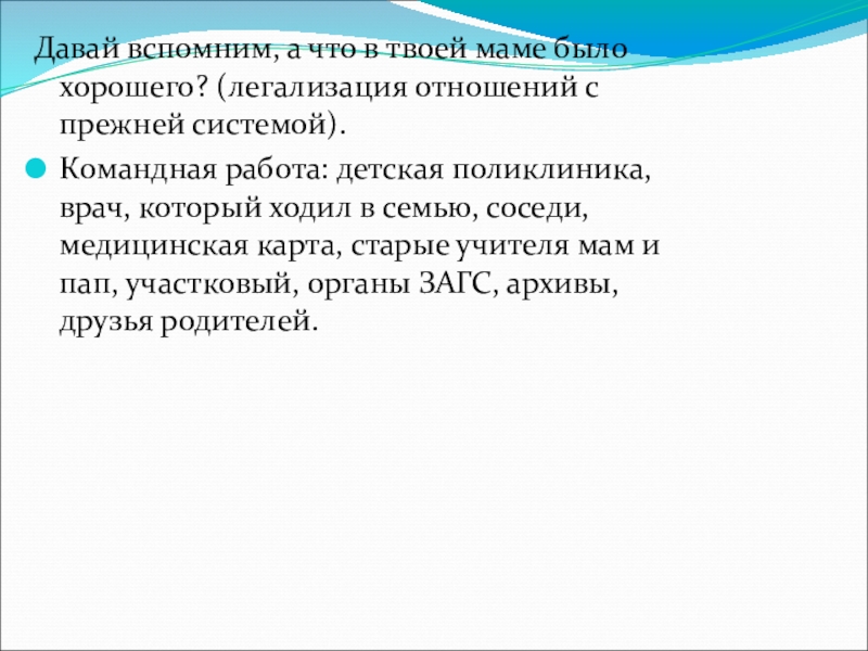 Давай вспомним, а что в твоей маме было хорошего? (легализация отношений с прежней системой).Командная работа: детская поликлиника,