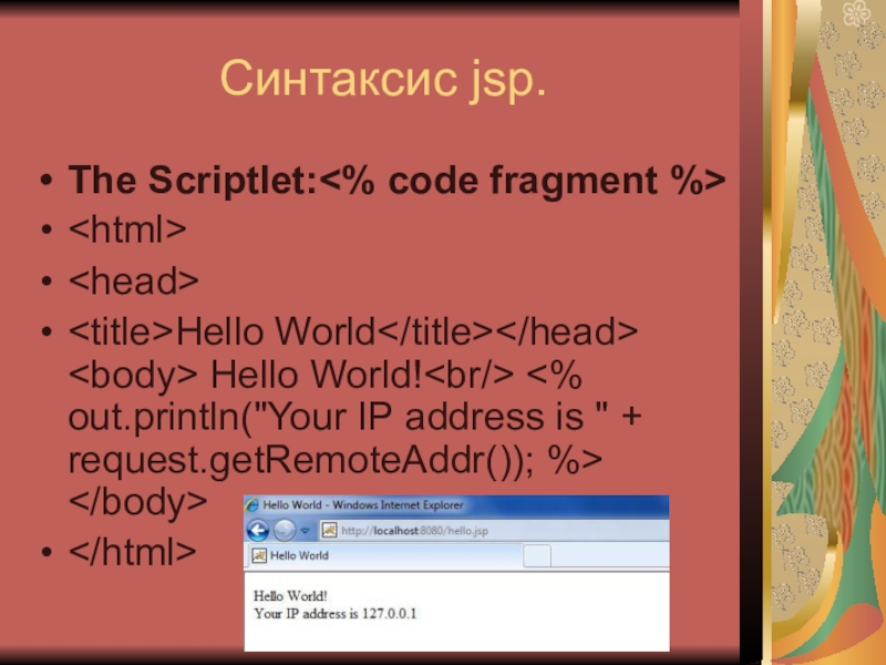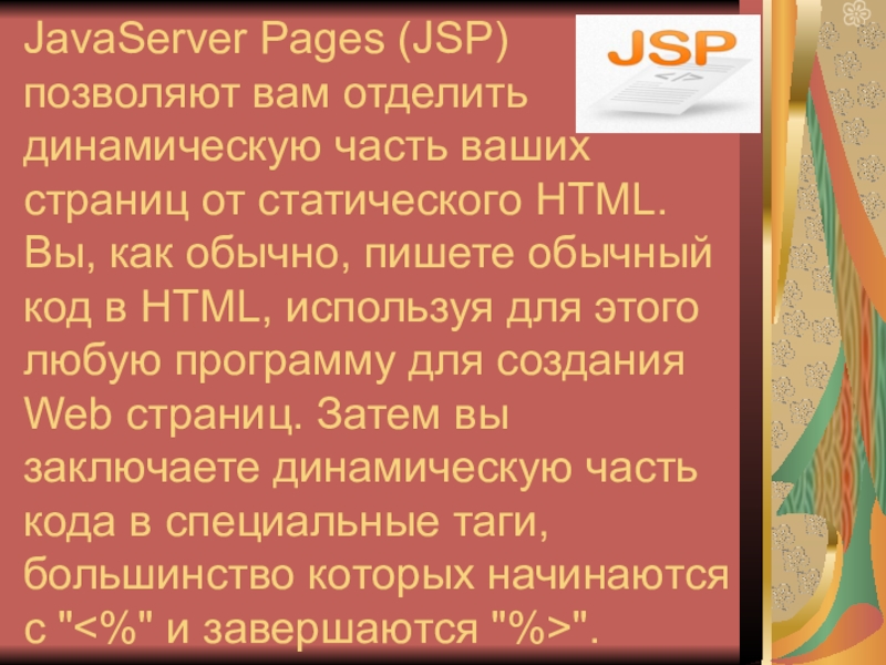 Слайд 3JavaServer Pages (JSP) позволяют вам отделить динамическую часть ваших страниц от