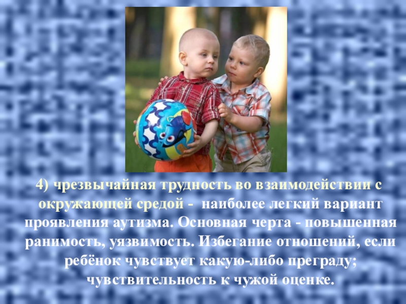 наиболее легкий вариант проявления аутизма. Основная черта - повышенная ранимость, уязвимость. Избегание отношений, если ребёнок чувствует какую-либо преграду; чувствительность к чужой оценке.