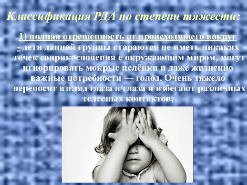 вокруг - дети данной группы стараются не иметь никаких точек соприкосновения с окружающим миром, могут игнорировать мокрые пелёнки и даже жизненно важные потребности — голод. Очень тяжело переносят взгляд глаза в глаза и избегают различных телесных контактов;
