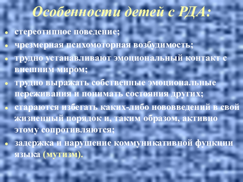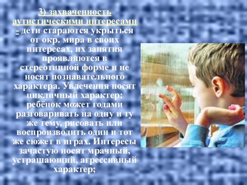 окр. мира в своих интересах, их занятия проявляются в стереотипной форме и не носят познавательного характера. Увлечения носят цикличный характер: ребёнок может годами разговаривать на одну и ту же тему, рисовать или воспроизводить один и тот же сюжет в играх. Интересы зачастую носят мрачный, устрашающий, агрессивный характер;