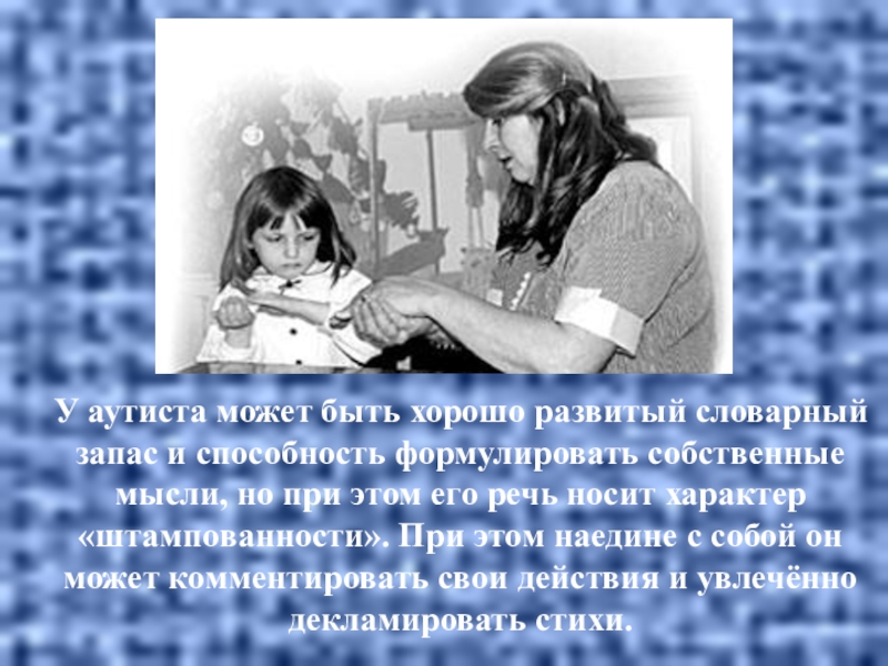 Слайд 5 У аутиста может быть хорошо развитый словарный запас и