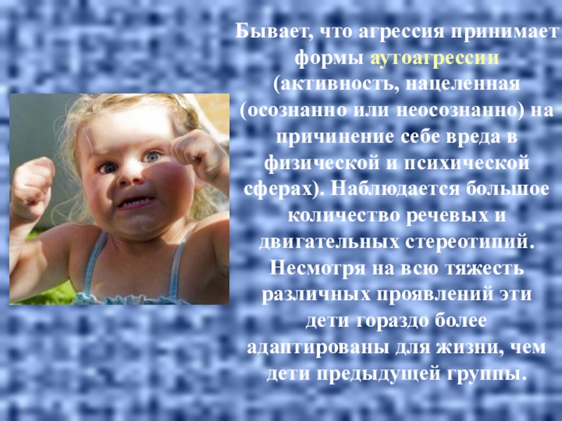 неосознанно) на причинение себе вреда в физической и психической сферах). Наблюдается большое количество речевых и двигательных стереотипий. Несмотря на всю тяжесть различных проявлений эти дети гораздо более адаптированы для жизни, чем дети предыдущей группы.