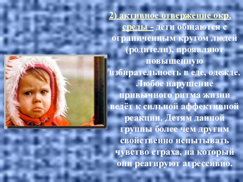 людей (родители), проявляют повышенную избирательность в еде, одежде. Любое нарушение привычного ритма жизни ведёт к сильной аффективной реакции. Детям данной группы более чем другим свойственно испытывать чувство страха, на который они реагируют агрессивно.