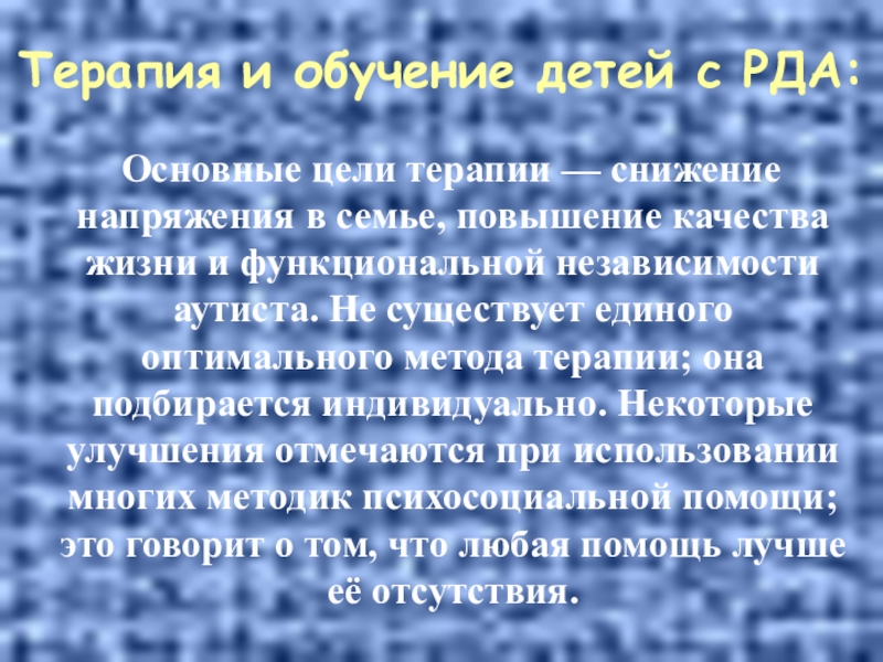 напряжения в семье, повышение качества жизни и функциональной независимости аутиста. Не существует единого оптимального метода терапии; она подбирается индивидуально. Некоторые улучшения отмечаются при использовании многих методик психосоциальной помощи; это говорит о том, что любая помощь лучше её отсутствия.