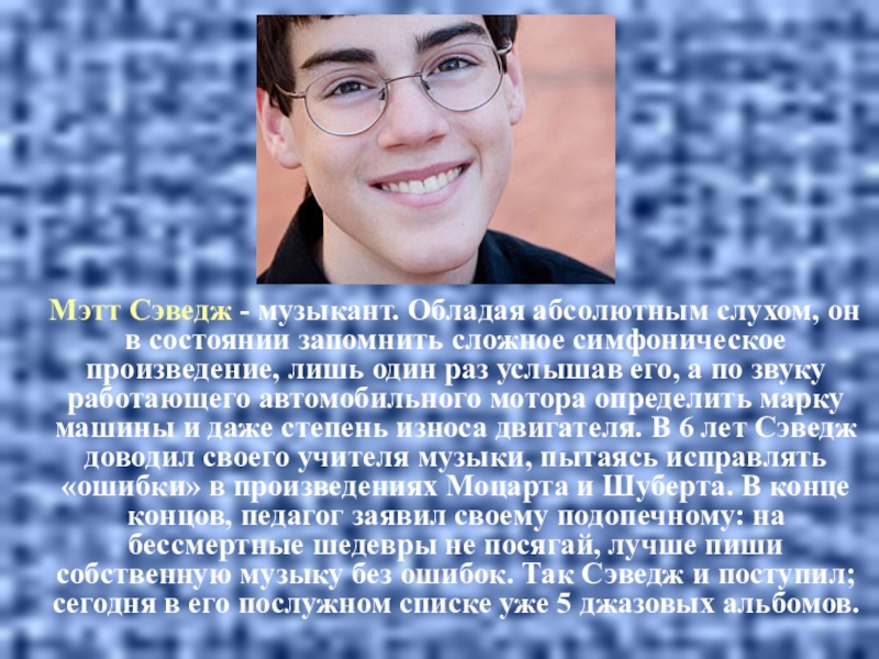 Слайд 19 Мэтт Сэведж - музыкант. Обладая абсолютным слухом, он в состоянии
