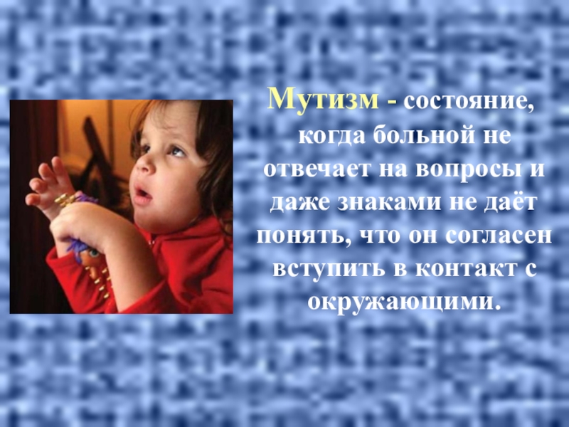 Слайд 4 Мутизм - состояние, когда больной не отвечает на вопросы и