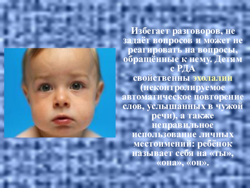 на вопросы, обращённые к нему. Детям с РДА свойственны эхолалии (неконтролируемое автоматическое повторение слов, услышанных в чужой речи), а также неправильное использование личных местоимений: ребёнок называет себя на «ты», «она», «он».