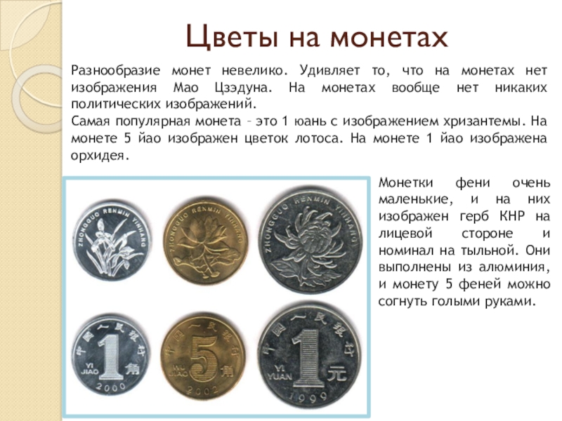 Монетки фени очень маленькие, и на них изображен герб КНР на лицевой стороне и номинал на тыльной. Они выполнены из алюминия, и монету 5 феней можно согнуть голыми руками.