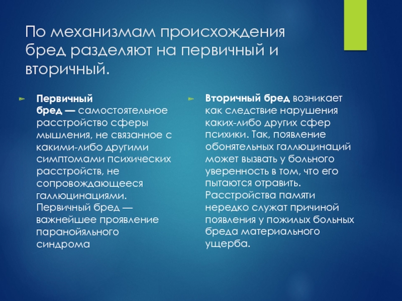 Слайд 27По механизмам происхождения бред разделяют на первичный и вторичный.
