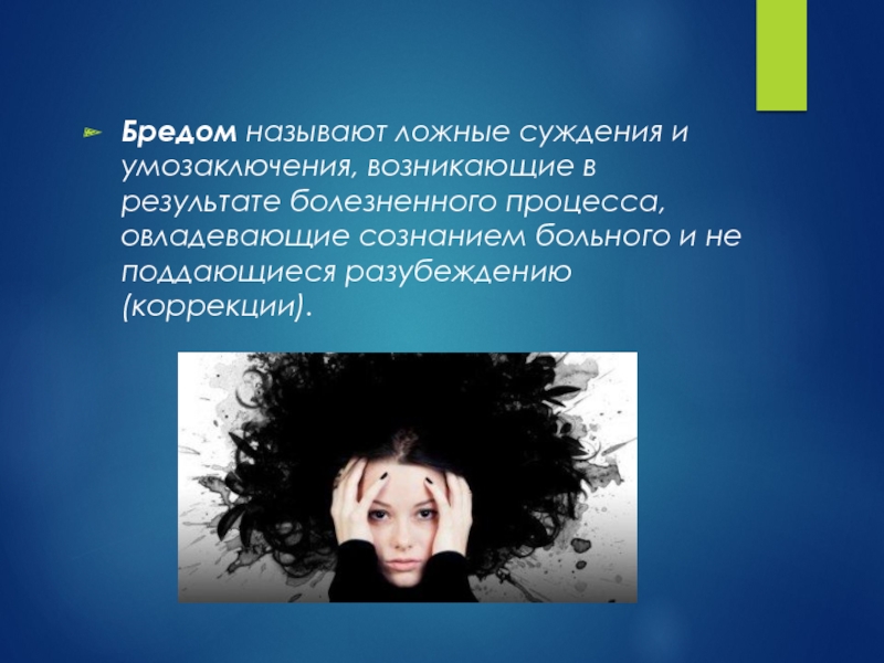 Слайд 25Бредом называют ложные суждения и умозаключения, возникающие в результате болезненного процесса, овладевающие