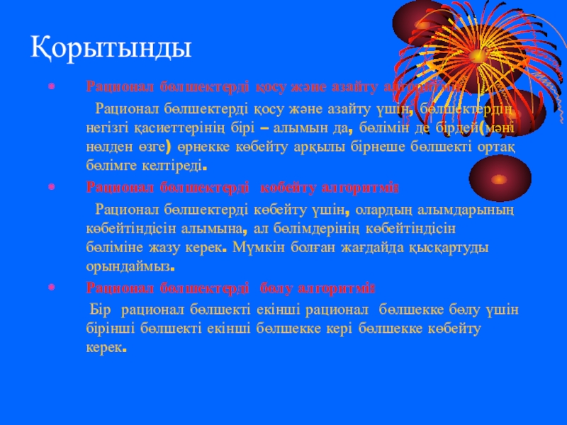 ҚорытындыРационал бөлшектерді қосу және азайту алгоритмі:     Рационал бөлшектерді қосу және азайту үшін, бөлшектердің