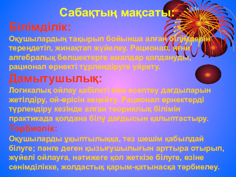 Сабақтың мақсаты:Білімділік:Оқушылардың тақырып бойынша алған білімдерін тереңдетіп, жинақтап жүйелеу. Рационал, яғни алгебралық бөлшектерге амалдар қолдануды, рационал өрнекті тұрлендіруге үйрету.Дамытушылық:Логикалық ойлау қабілеті мен есептеу дағдыларын жетілдіру, ой-өрісін кеңейту. Рационал өрнектерді түрлендіру кезінде алған теориялық білімін практикада қолдана
