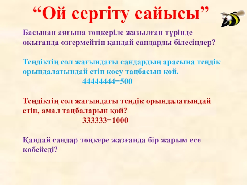 “Ой сергіту сайысы”Басынан аяғына төңкеріле жазылған түрінде оқығанда өзгермейтін қандай сандарды білесіңдер? Теңдіктің сол жағындағы сандардың арасына