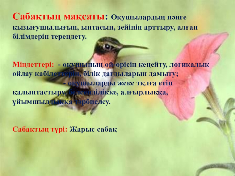 Сабақтың мақсаты: Оқушылардың пәнге қызығушылығын, ынтасын, зейінін арттыру, алған білімдерін