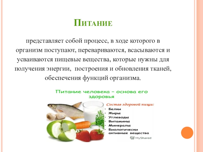 представляет собой процесс, в ходе которого в организм поступают, перевариваются, всасываются