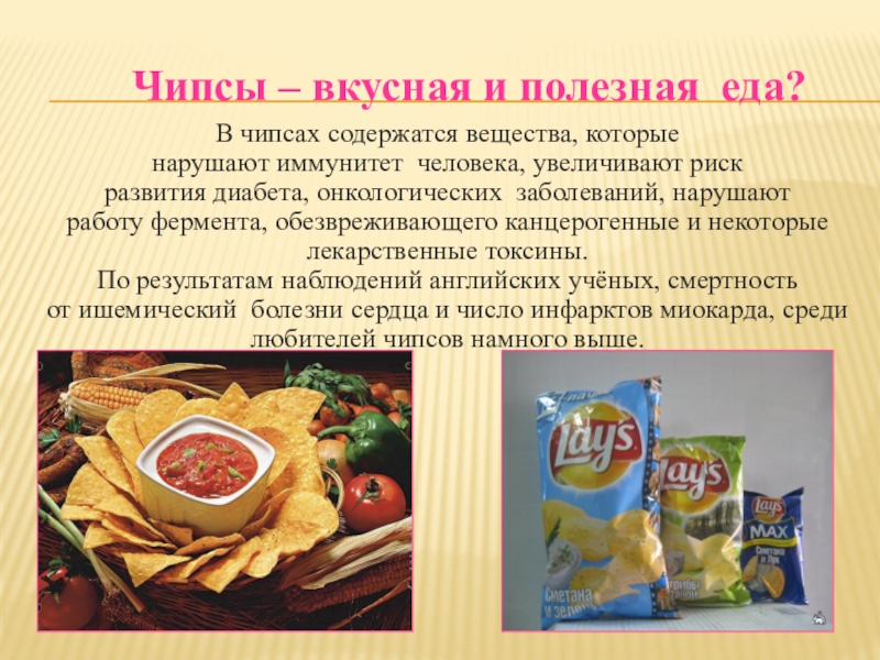 По результатам наблюдений английских учёных, смертность от ишемический болезни сердца и число инфарктов миокарда, среди любителей чипсов намного выше.