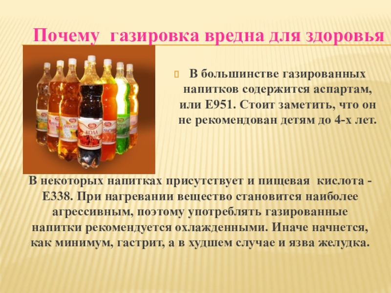 В некоторых напитках присутствует и пищевая кислота - E338. При нагревании вещество становится наиболее агрессивным, поэтому употреблять газированные напитки рекомендуется охлажденными. Иначе начнется, как минимум, гастрит, а в худшем случае и язва желудка.