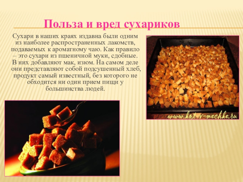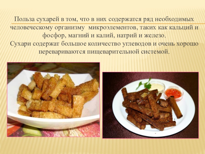 Слайд 20Польза сухарей в том, что в них содержатся ряд необходимых человеческому