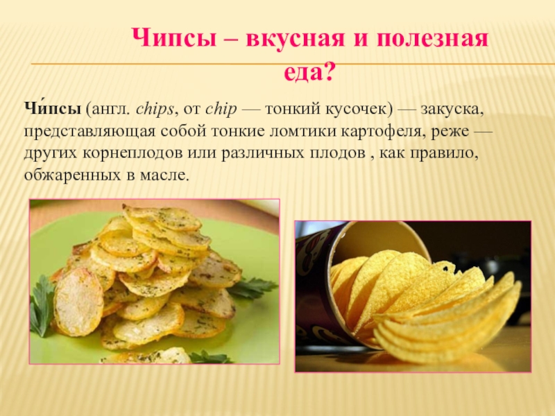 Чи́псы (англ. chips, от chip — тонкий кусочек) — закуска, представляющая собой