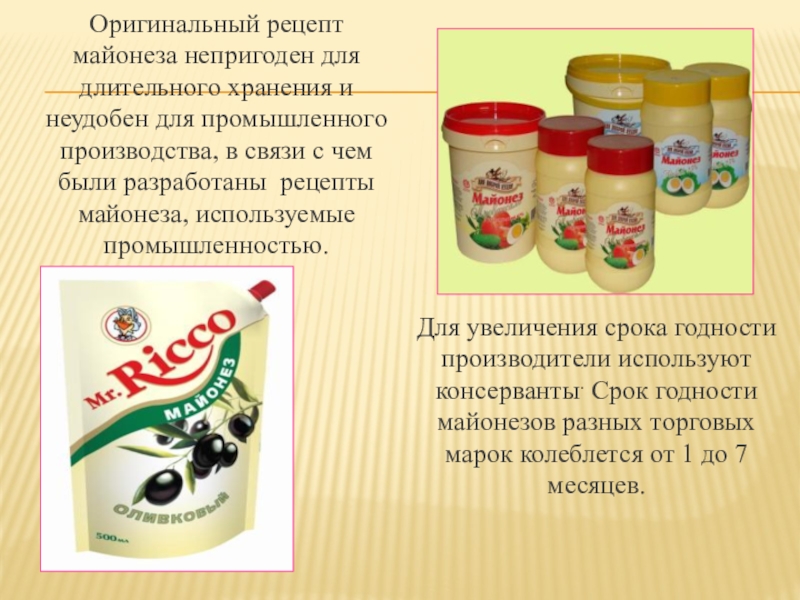 Слайд 23Оригинальный рецепт майонеза непригоден для длительного хранения и неудобен для промышленного