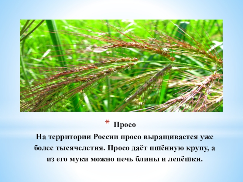 На территории России просо выращивается уже более тысячелетия. Просо даёт пшённую