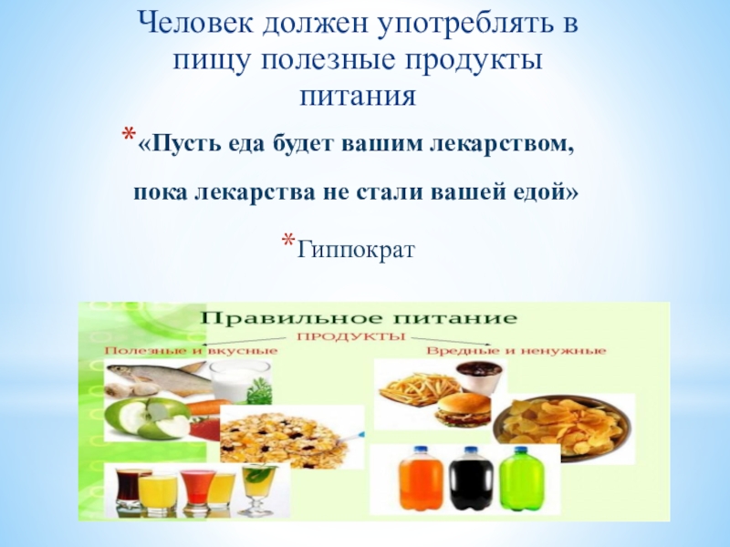 Слайд 41Человек должен употреблять в пищу полезные продукты питания