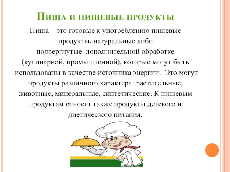 натуральные либо подвергнутые дополнительной обработке (кулинарной, промышленной), которые могут быть использованы в качестве источника энергии. Это могут продукты различного характера: растительные, животные, минеральные, синтетические. К пищевым продуктам относят также продукты детского и диетического питания.