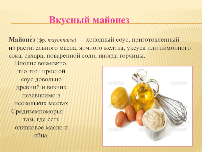 Майоне́з (фр. mayonnaise) — холодный соус, приготовленный из растительного масла, яичного желтка, уксуса или лимонного сока, сахара, поваренной соли, иногда горчицы.