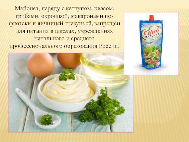 Слайд 24Майонез, наряду с кетчупом, квасом, грибами, окрошкой, макаронами по-флотски и яичницей-глазуньей,