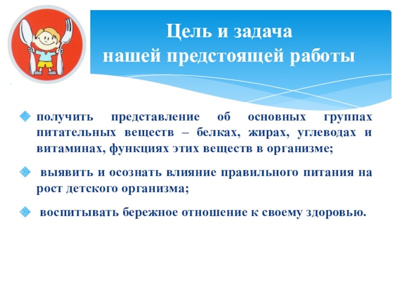 Слайд 4получить представление об основных группах питательных веществ – белках, жирах, углеводах