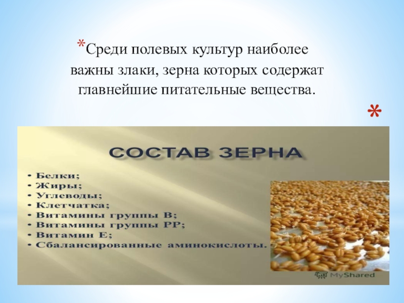 Среди полевых культур наиболее важны злаки, зерна которых содержат главнейшие питательные