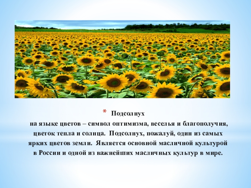 тепла и солнца. Подсолнух, пожалуй, один из самых ярких цветов земли. Является основной масличной культурой в России и одной из важнейших масличных культур в мире.