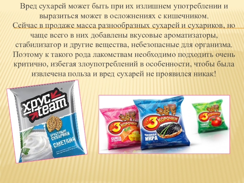 Сейчас в продаже масса разнообразных сухарей и сухариков, но чаще всего в них добавлены вкусовые ароматизаторы, стабилизатор и другие вещества, небезопасные для организма. Поэтому к такого рода лакомствам необходимо подходить очень критично, избегая злоупотреблений в особенности, чтобы была извлечена польза и вред сухарей не проявился никак!