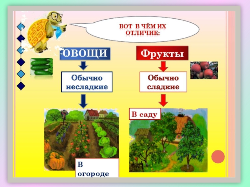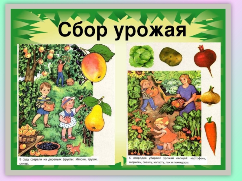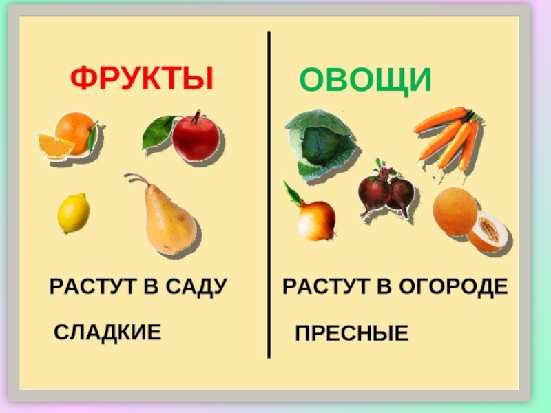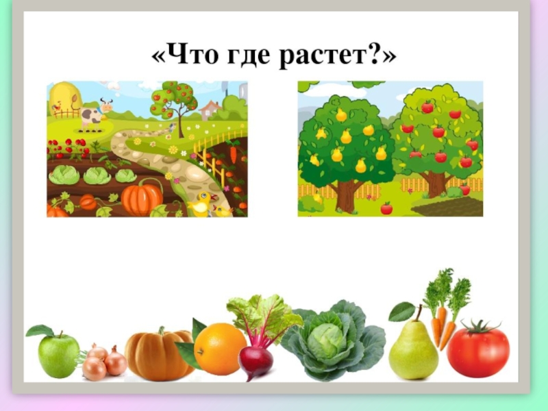 Различение растений огорода (овощи), сада (фрукты, ягоды)