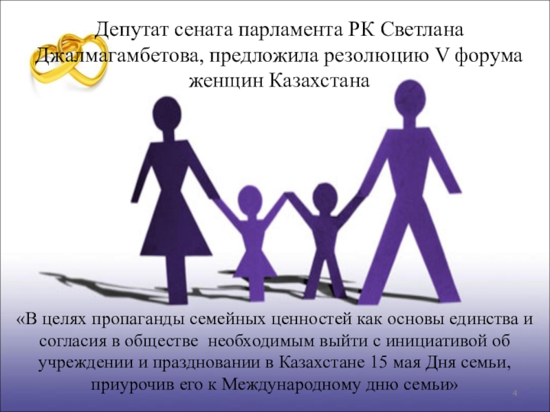 «В целях пропаганды семейных ценностей как основы единства и согласия в обществе необходимым выйти с инициативой об учреждении и праздновании в Казахстане 15 мая Дня семьи, приурочив его к Международному дню семьи»
