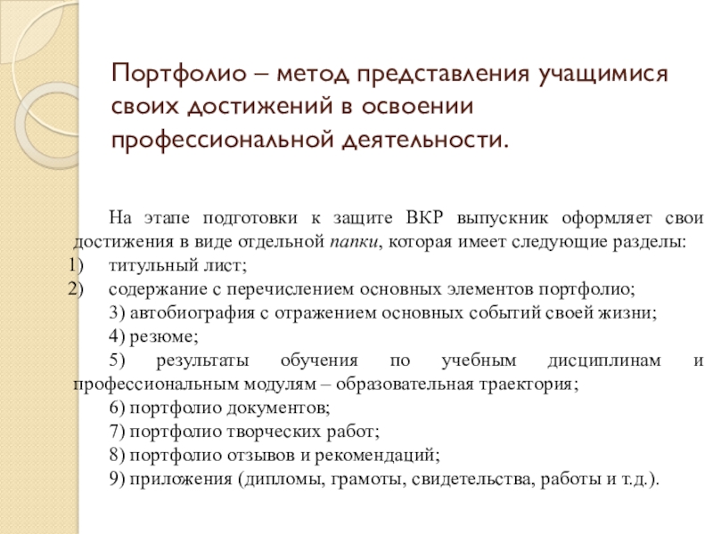 На этапе подготовки к защите ВКР выпускник оформляет свои достижения в виде отдельной папки, которая имеет следующие разделы: